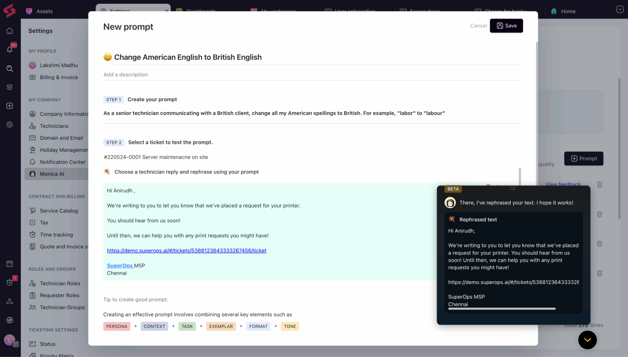 Grâce à des messages-guides personnalisés, Monica affine vos messages, garantissant que chaque interaction avec le client reflète le ton et le professionnalisme de votre MSP.
