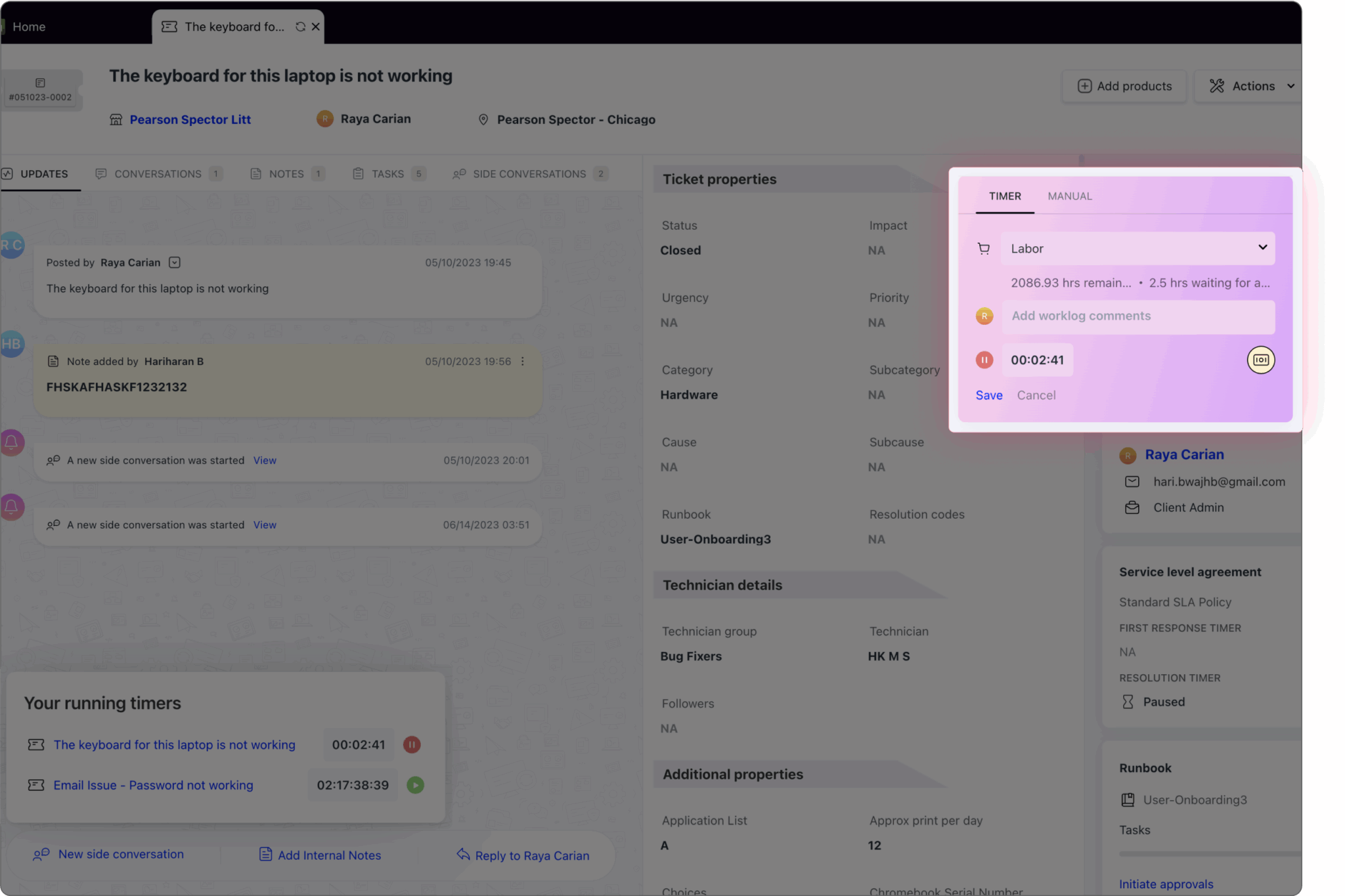 Le minuteur automatique démarre dès que vous commencez à travailler sur un ticket.