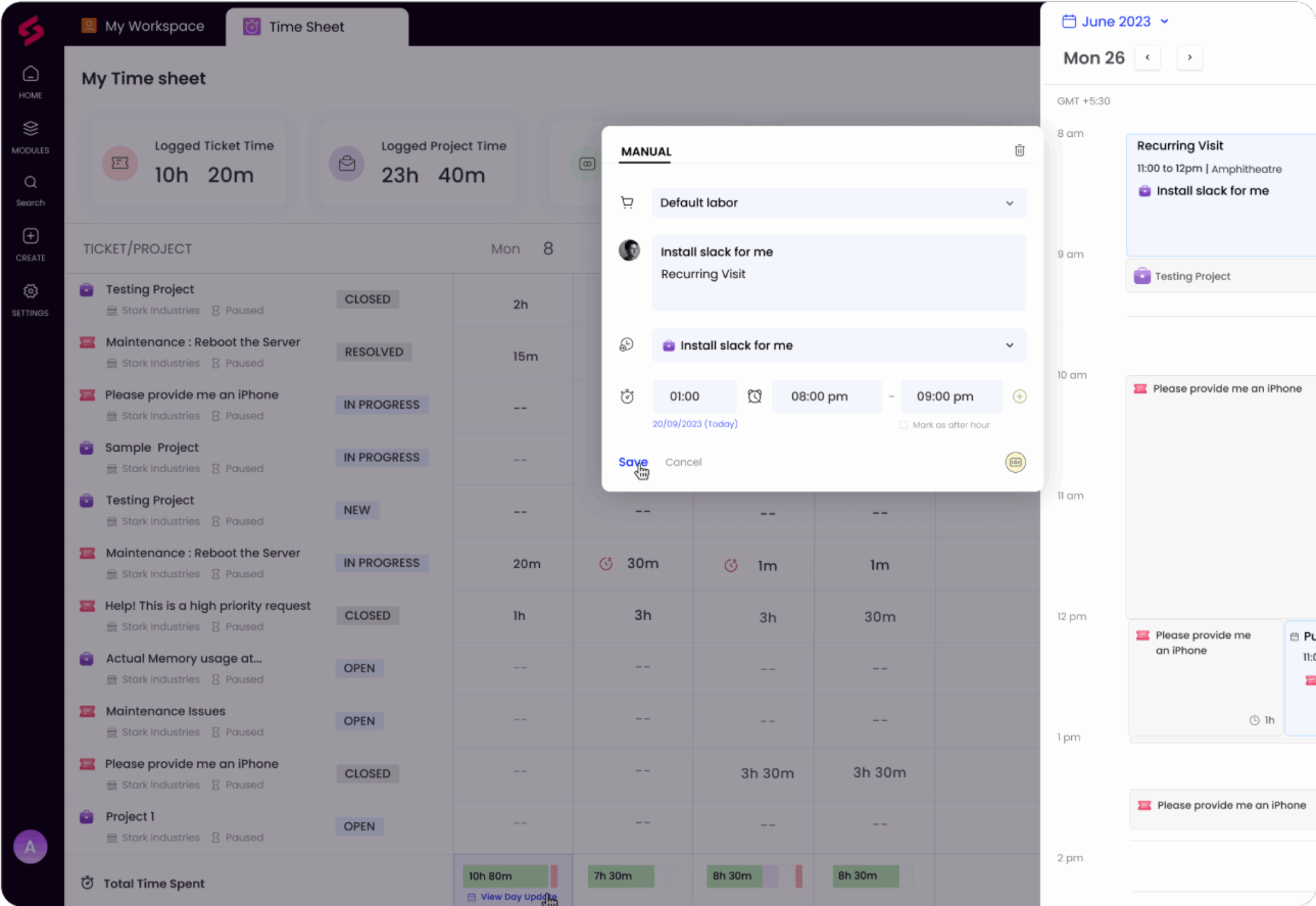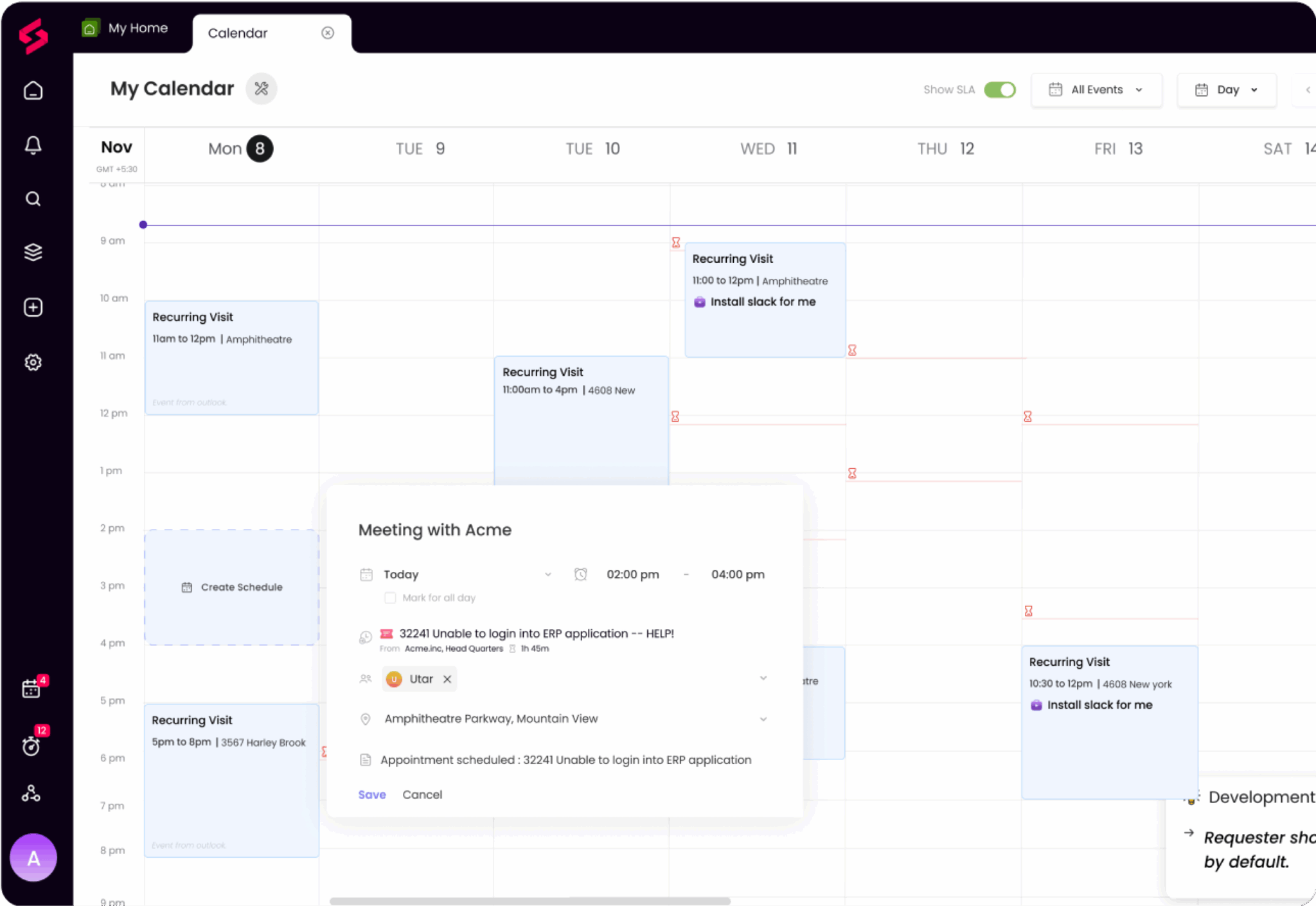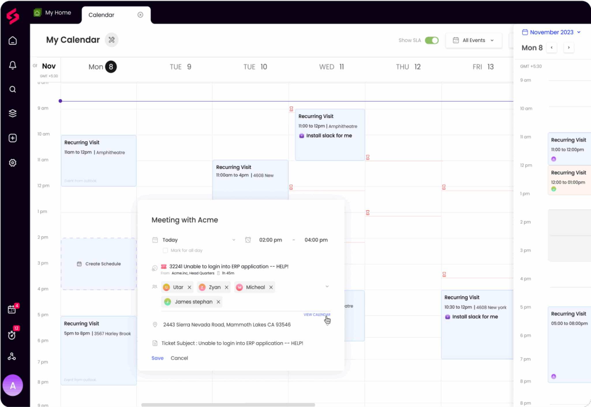 Ne manquez pas d’enregistrer les visites de sites. Affichez les rendez-vous programmés ainsi que les autres dossiers de travail dans le calendrier SuperOps et ajoutez ces visites en tant que dossiers de travail directement depuis le calendrier.