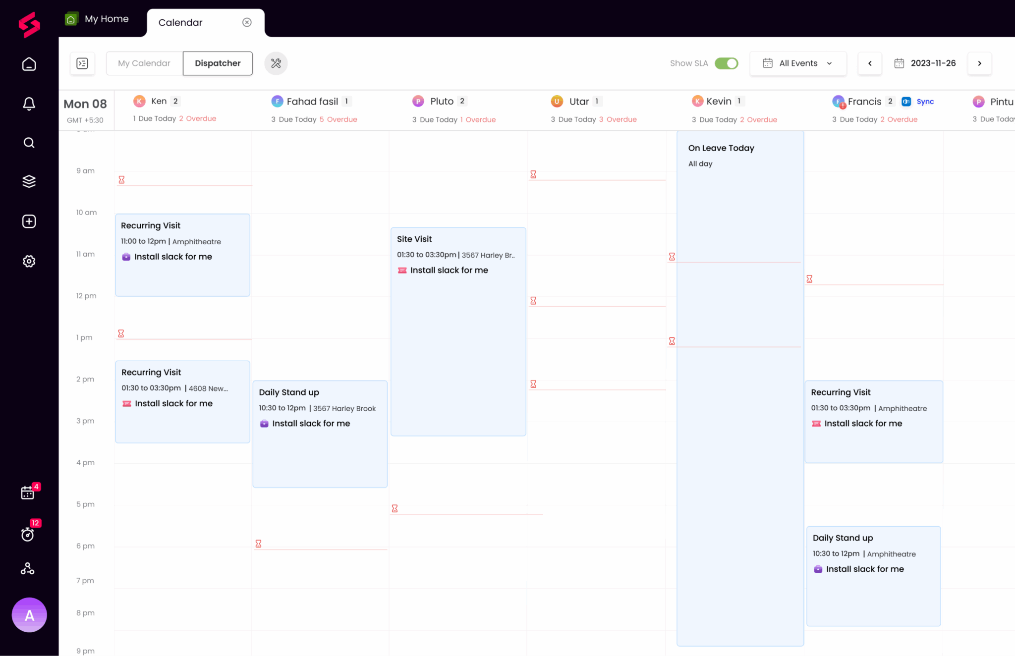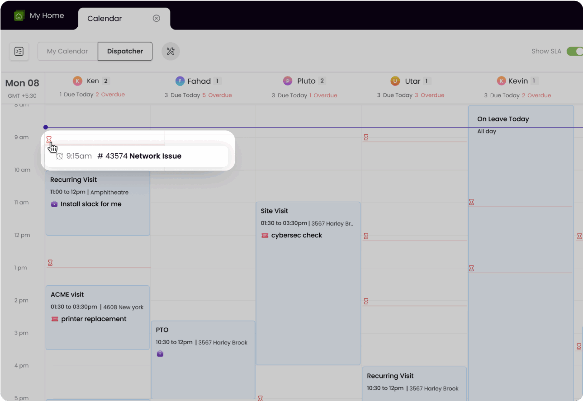 Consultez les accords de niveau de service des techniciens sur le calendrier de répartition et assignez des visites sur site sans compromettre les autres engagements du client.