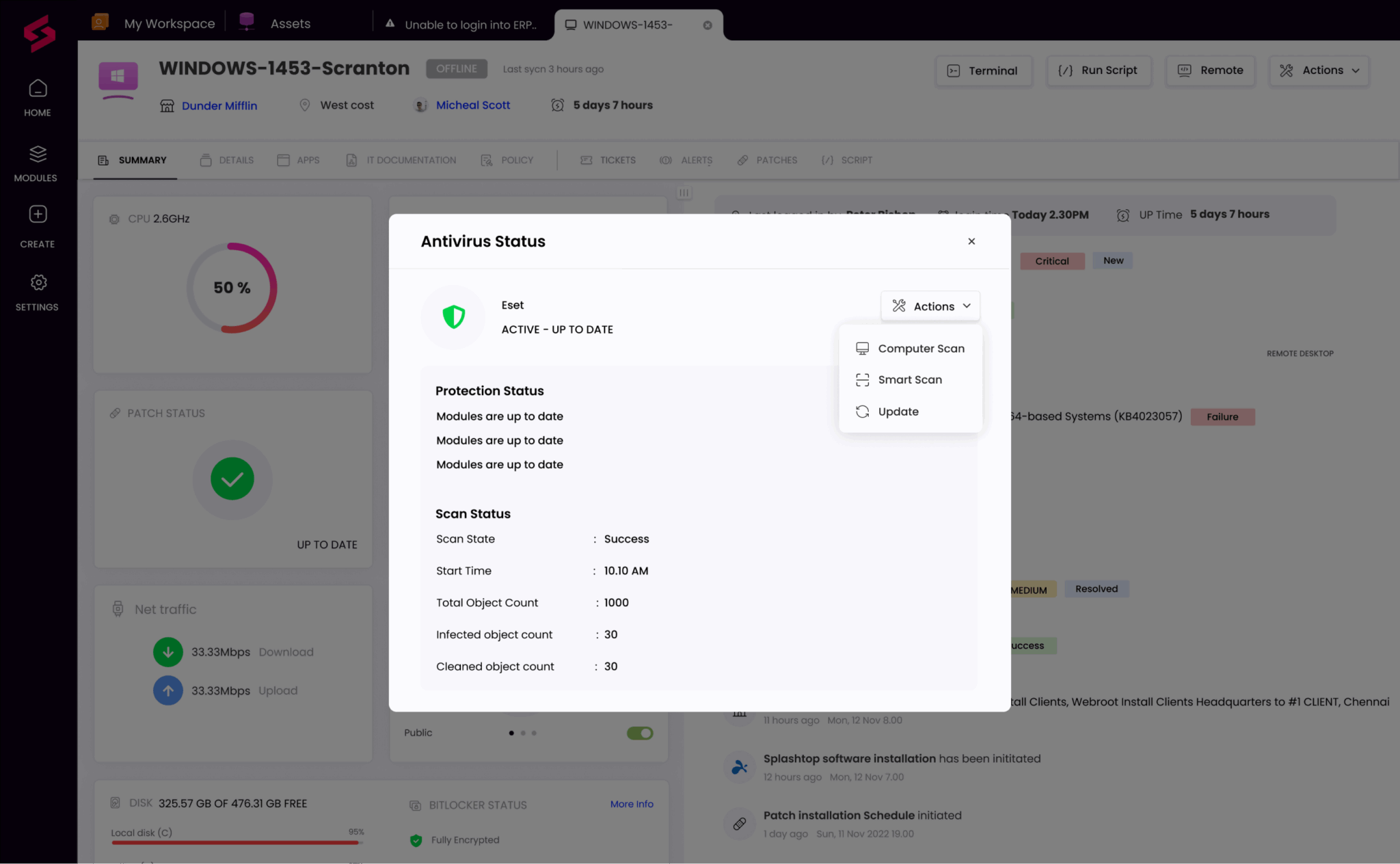 Atténuez les risques en gérant la cybersécurité des postes de travail et des serveurs, directement dans SuperOps.